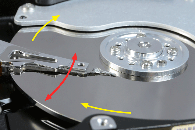 HDDは、回転しているディスクの上をヘッドが移動してデータを読み書きします。